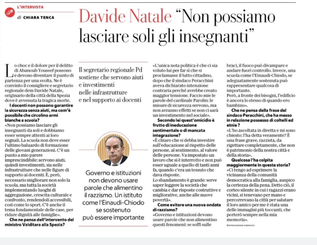 Lo choc e il dolore per il delitto di Abanoub Youssef possono e devono diventare il punto di partenza per una svolta. Ne è convinto il consigliere e segretario regionale dem Davide Natale, originario della città della Spezia dove è avvenuta la tragica morte.
