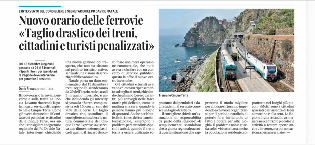 Se serviva una dimostrazione plastica di quanto il rincaro dei costi del Cinque Terre Express fosse una mera operazione commerciale, che nulla aveva a che fare con un concetto di servizio di trasporto pubblico, questa la offre il nuovo orario invernale di Trenitalia sulla tratta tra La Spezia e Levanto. Dal 15 dicembre i treni regionali passeranno dai 29 dell’orario estivo a soli cinque. Contando anche gli intercity si passerà da 48 treni complessivi a soli 15. Un calo del 70%.Spariti i turisti, il servizio conosce un taglio drastico proprio quando il treno torna a essere utilizzato soprattutto dai pendolari che per lavoro o studio si recano alla Spezia. Viene da chiedersi come vengano utilizzati i milioni di euro che ogni anno il flusso dei visitatori verso le Cinque Terre garantisce all’azienda ferroviaria. Di certo, non per migliorare l’accessibilità al Parco nazionale o per favorire la mobilità sostenibile dei suoi abitanti, come abbiamo sentito affermare alla destra in questi anni. È semplicemente scandaloso che la giunta regionale accetti questa situazione che oltretutto rappresenta un modo per affossare il turismo impedendo a chi vuole organizzarsi per il periodo natalizio nelle Cinque Terre di poterlo fare, invitandolo di fatto a optare per altri luoghi. Parliamo di un territorio che dovrebbe fare della programmazione della gestione turistica la principale azione di governo. Molti sono i cittadini che sono spaesati dall’assenza di treni alla mattina e alla sera. La Regione che a parole invita ai cittadini di rimanere nei centri più piccoli e le attività a restare aperte anche nel periodo invernale non riesce ad assicurare nessun tipo di servizio. Trenitalia tratta la Liguria, e in particolare le Cinque Terre, come una mucca da mungere e la giunta tratta i cittadini liguri come dei sudditi”.