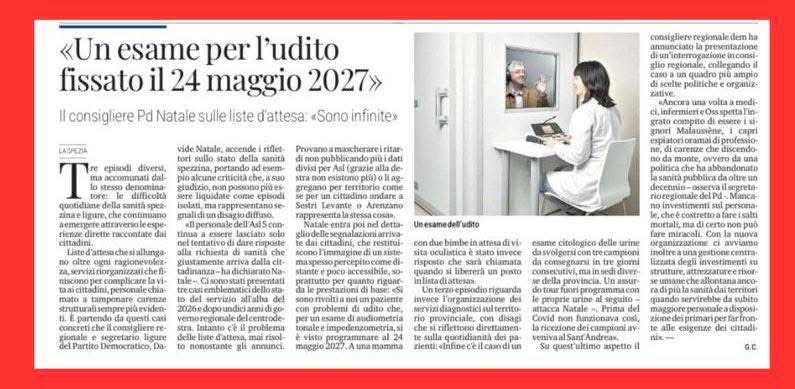 Liste d’attesa che si allungano oltre ogni ragionevolezza, servizi riorganizzati che finiscono per complicare la vita ai cittadini, personale chiamato a tamponare carenze strutturali sempre più evidenti. È partendo da questi casi concreti che il consigliere regionale e segretario ligure del Partito Democratico, Davide Natale, accende i riflettori sullo stato della sanità spezzina, portando ad esempio alcune criticità che, a suo giudizio, non possono più essere liquidate come episodi isolati, ma rappresentano segnali di un disagio diffuso.