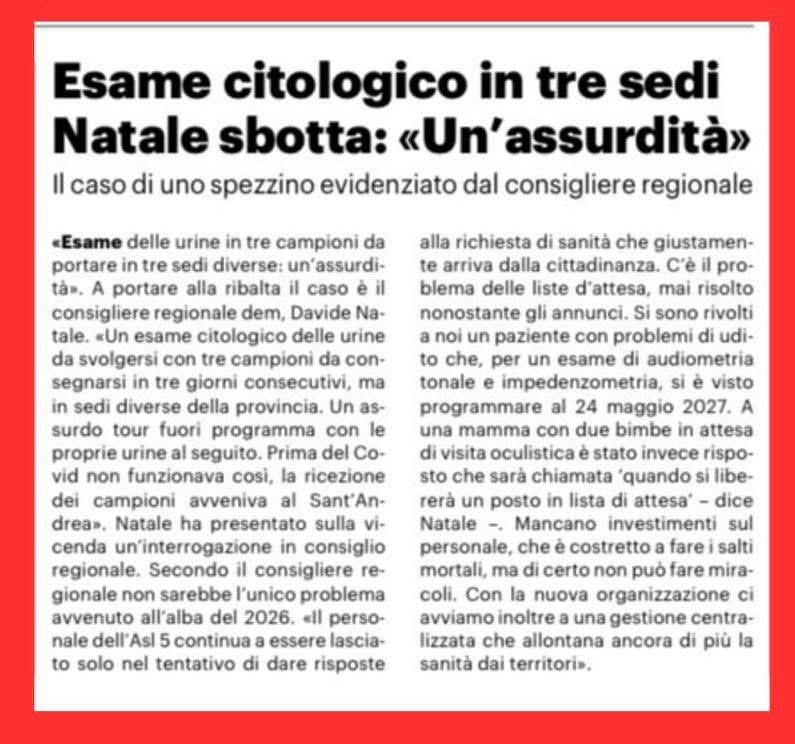 Un terzo episodio riguarda invece l’organizzazione dei servizi diagnostici sul territorio provinciale, con disagi che si riflettono direttamente sulla quotidianità dei pazienti: «Infine c’è il caso di un esame citologico delle urine da svolgersi con tre campioni da consegnarsi in tre giorni consecutivi, ma in sedi diverse della provincia. Un assurdo tour fuori programma con le proprie urine al seguito -attacca Natale -. Prima del Covid non funzionava così, la ricezione dei campioni avveniva al Sant’Andrea». Su quest’ultimo aspetto il consigliere regionale dem ha annunciato la presentazione di un interrogazione in consiglio regionale, collegando il caso a un quadro più ampio di scelte politiche e organizzative.